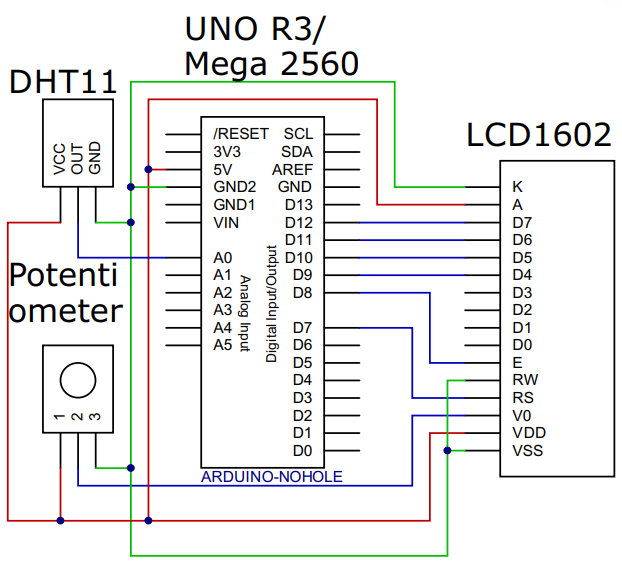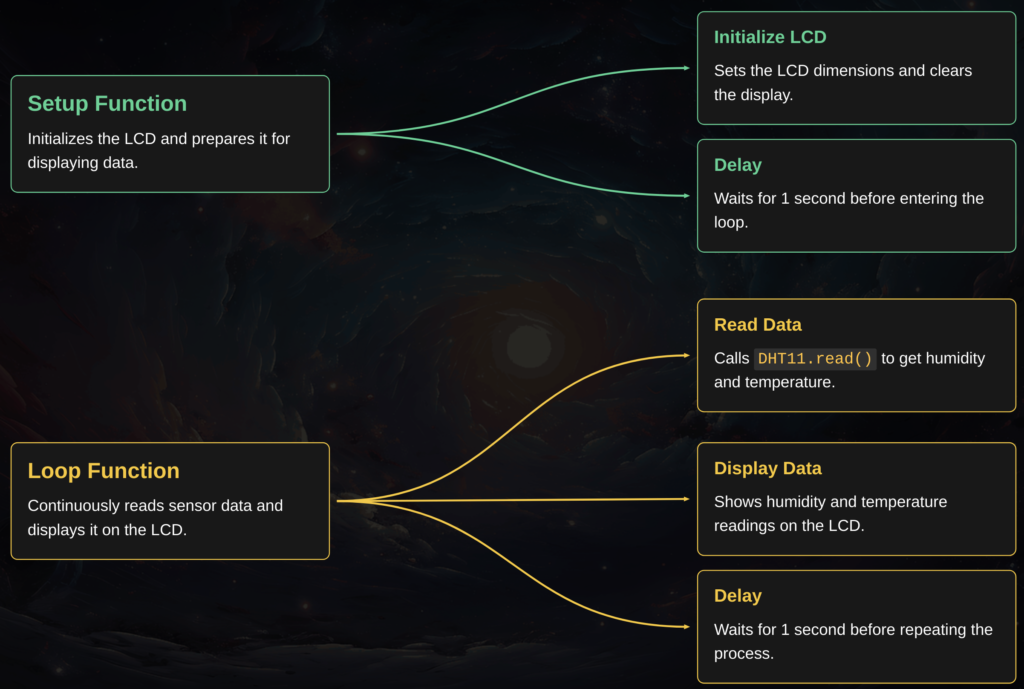 In the main loop, it continuously reads sensor data every second, displays the humidity on the first line of the LCD and the temperature on the second line.