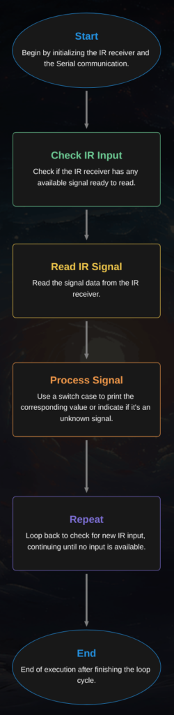 When a button is pressed on the remote, the program reads the specific signal code and prints a corresponding numeric value to the Serial Monitor.