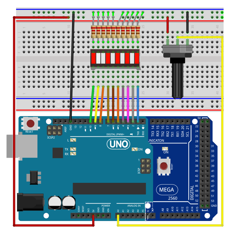 In the loop(), it reads the resistance value and maps it to a range from 0 to 11 AND illuminates LEDs based on the potentiometer’s position.