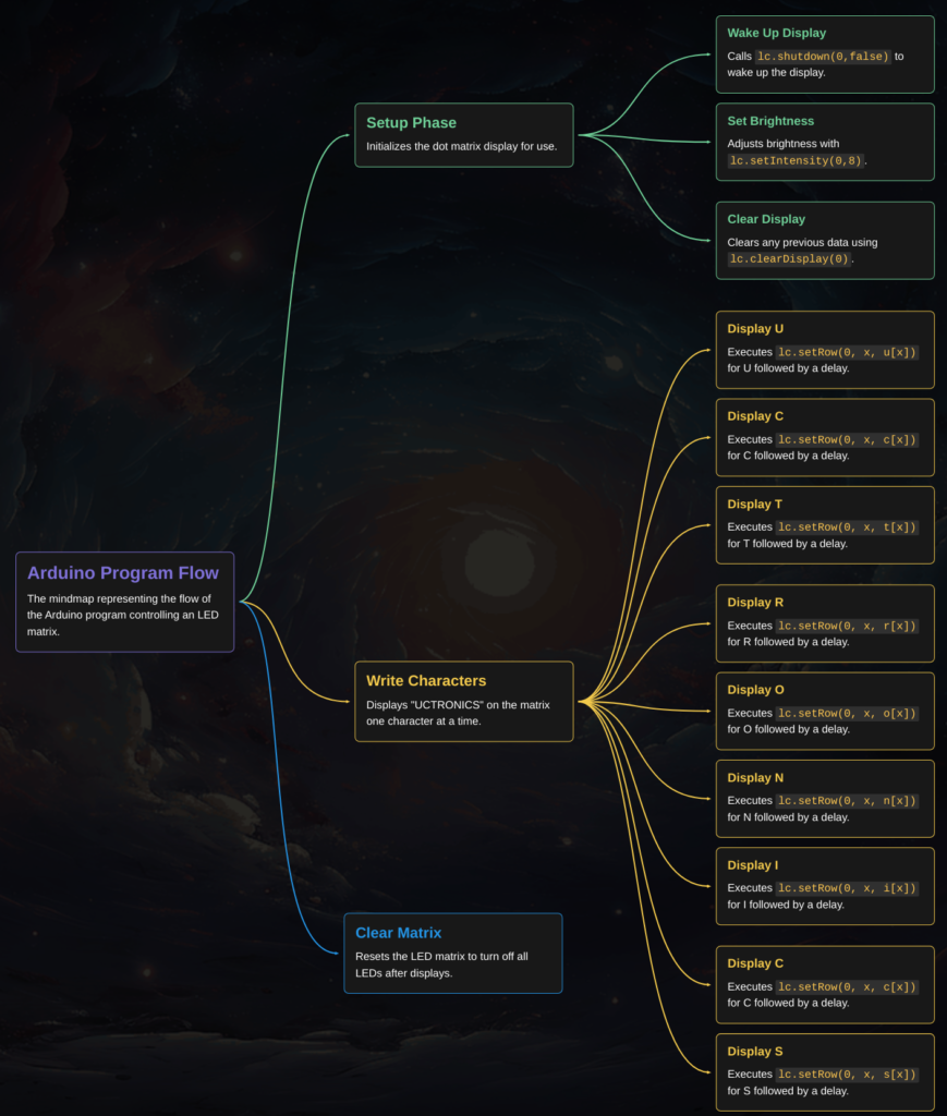 The main functionality, found in the writeArduinoOnMatrix function, displays each character one after the other with a 1-second delay between each one.